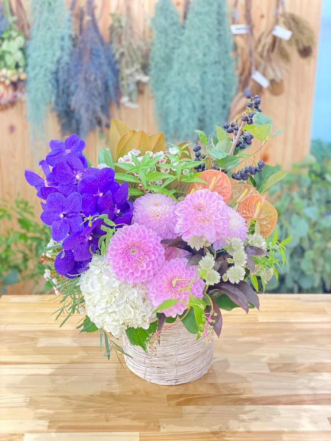 お祝いや感謝の気持ちを伝えたいシーンにぴったりです。また、四季折々の美しさを楽しめるアレジメントは、フラワーギフトの定番として、多くの方に愛されています。お花の鮮やかな色合いや香りは、お部屋に華やかな雰囲気をもたらし、リラックスしたひとときを演出します。